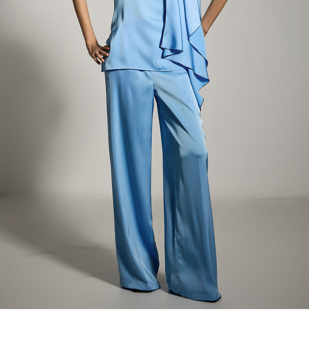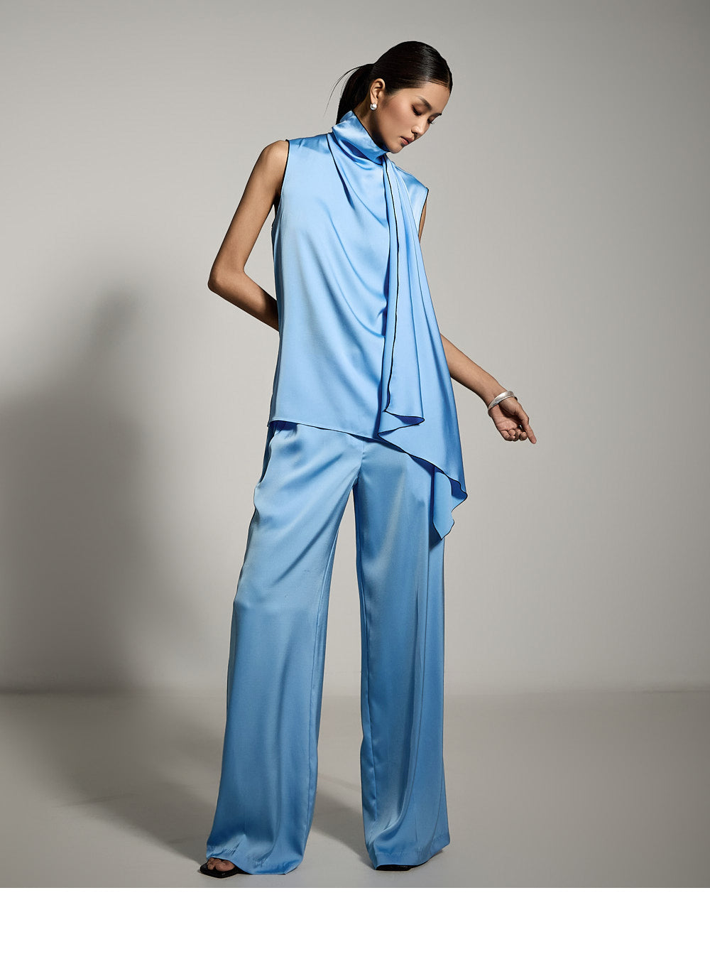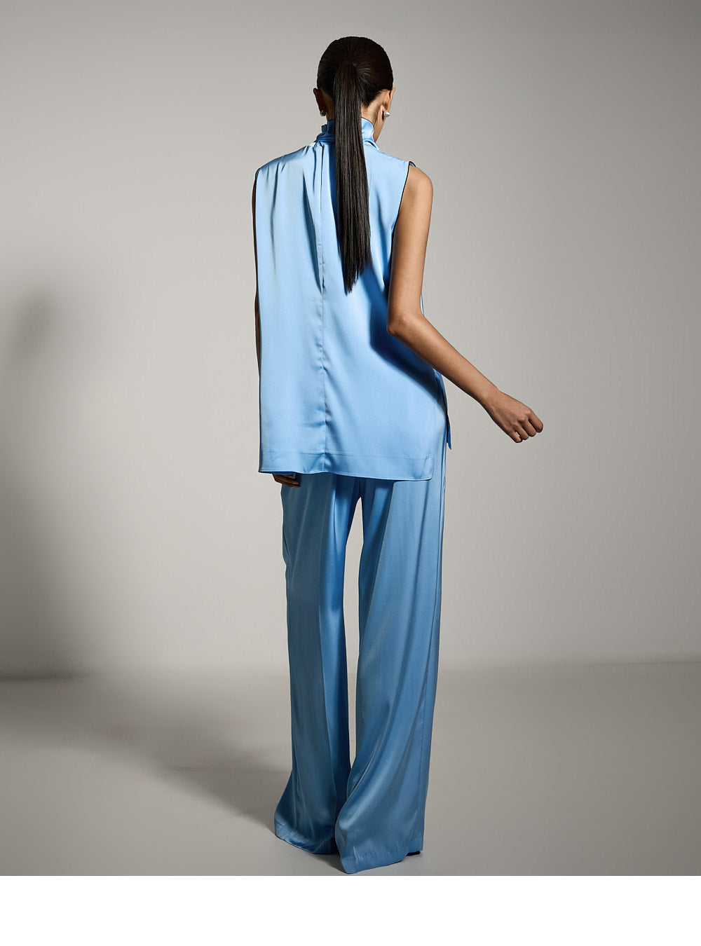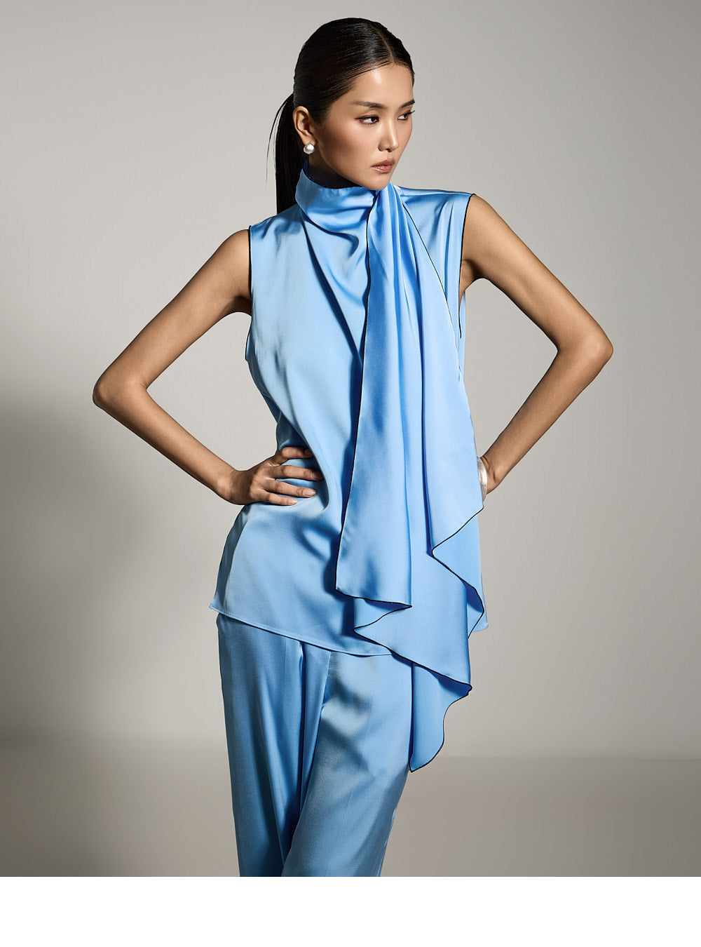 模特身高 173 厘米,穿着天蓝色均码服装。