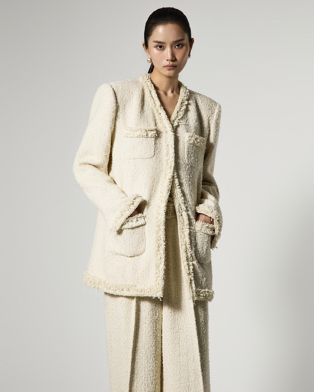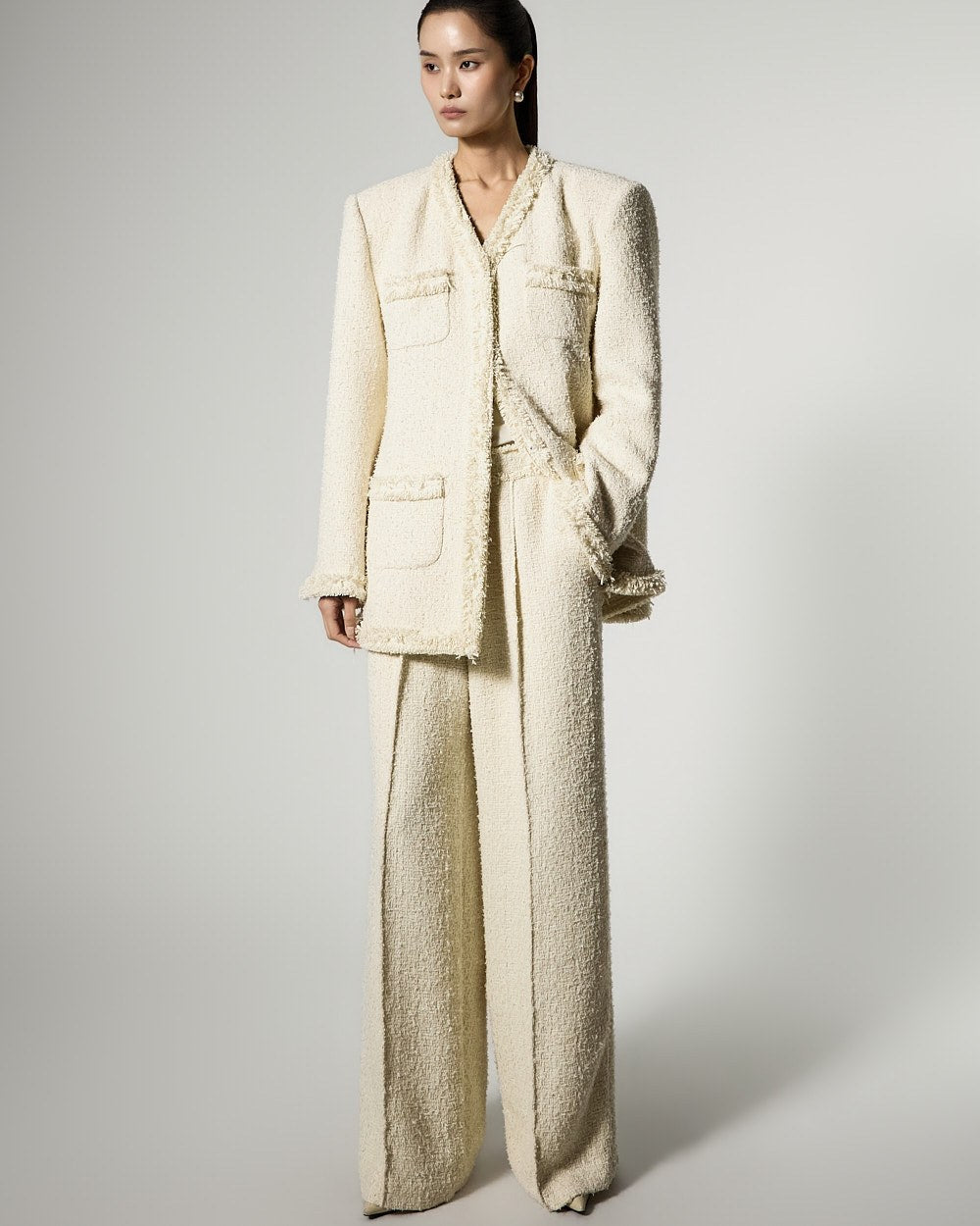 这是一款经典风格的粗花呢夹克和裤子套装。