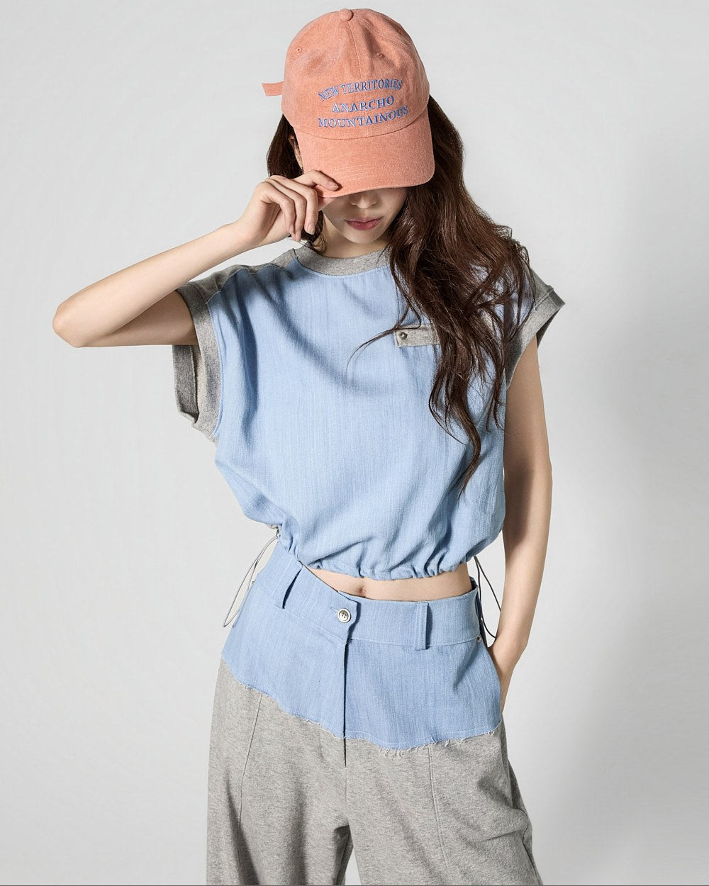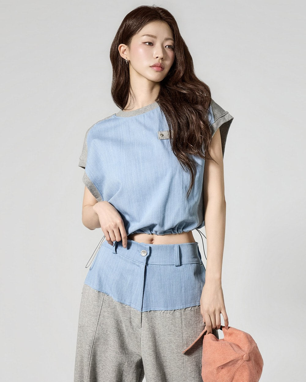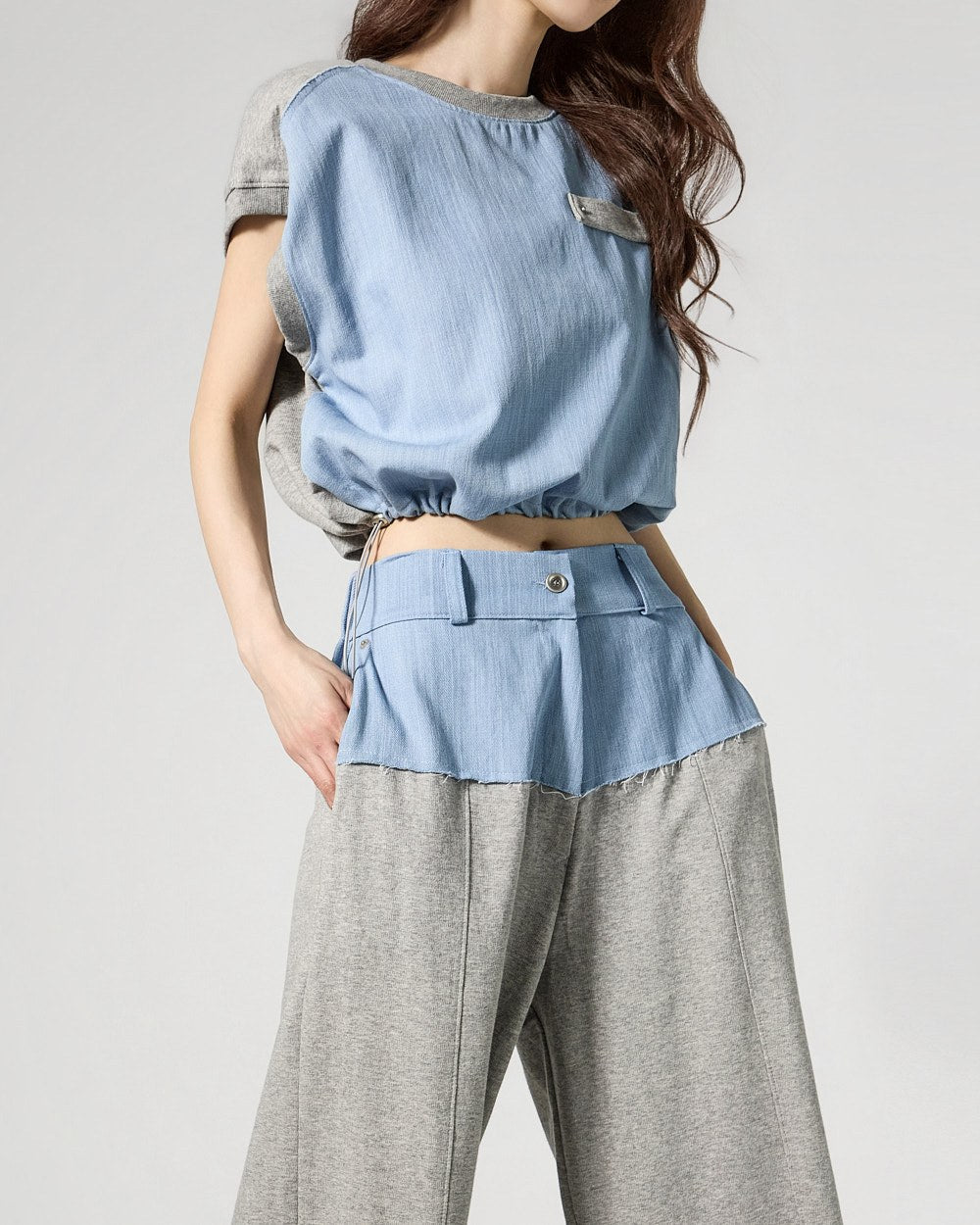 The top features a drawstring at the hem for adjustable fit,