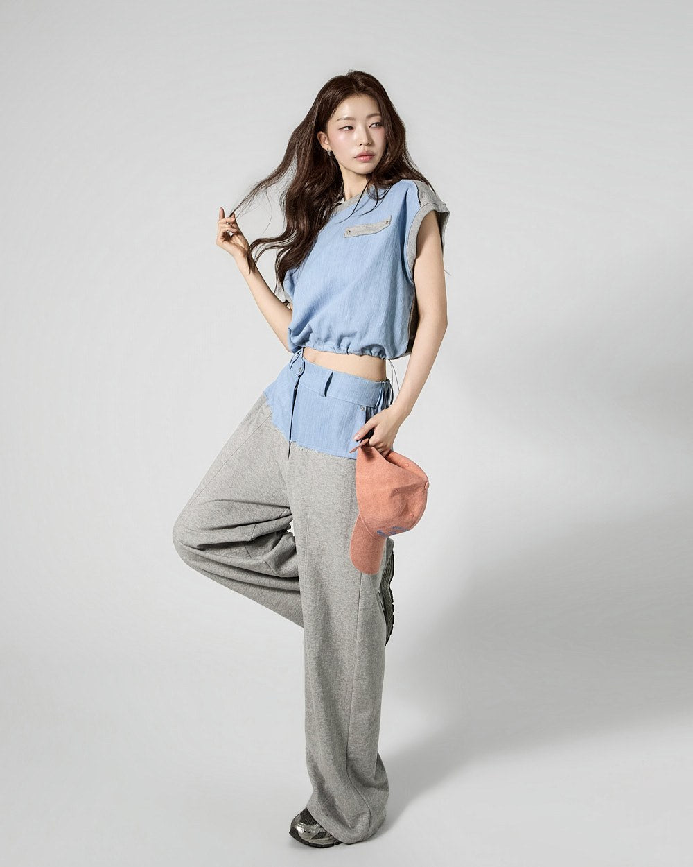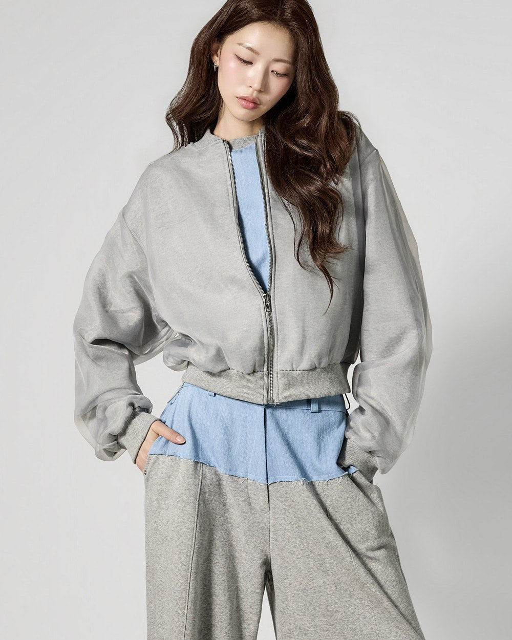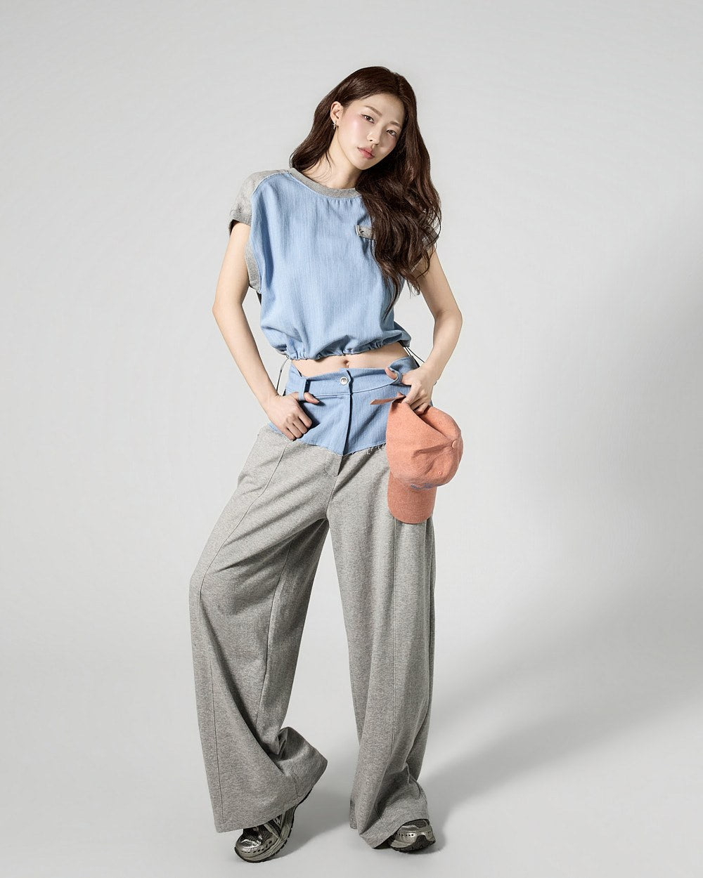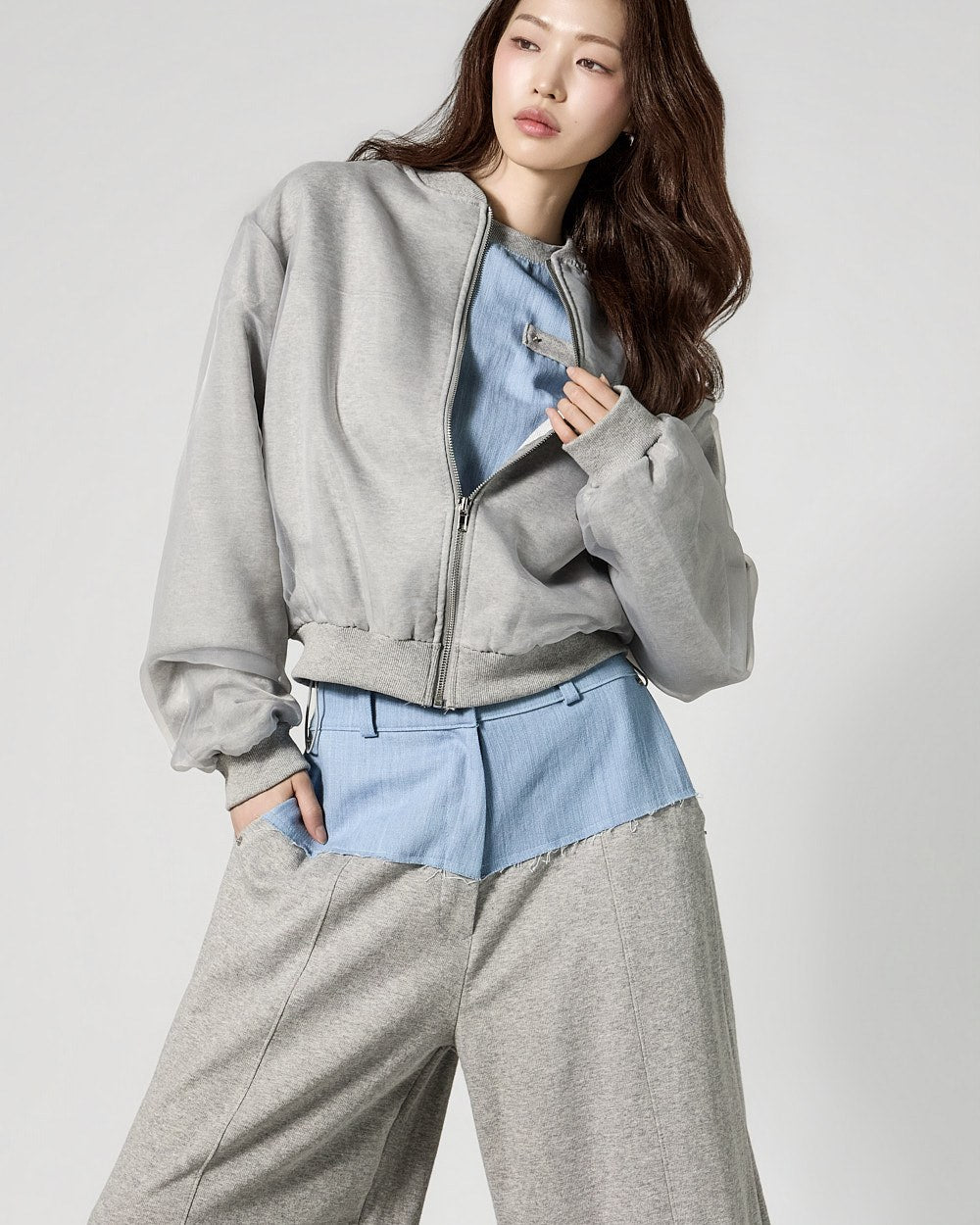 This is a denim contrast tracksuit set with a casual vibe.