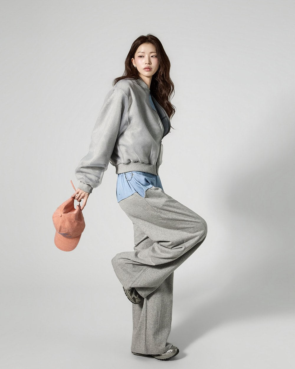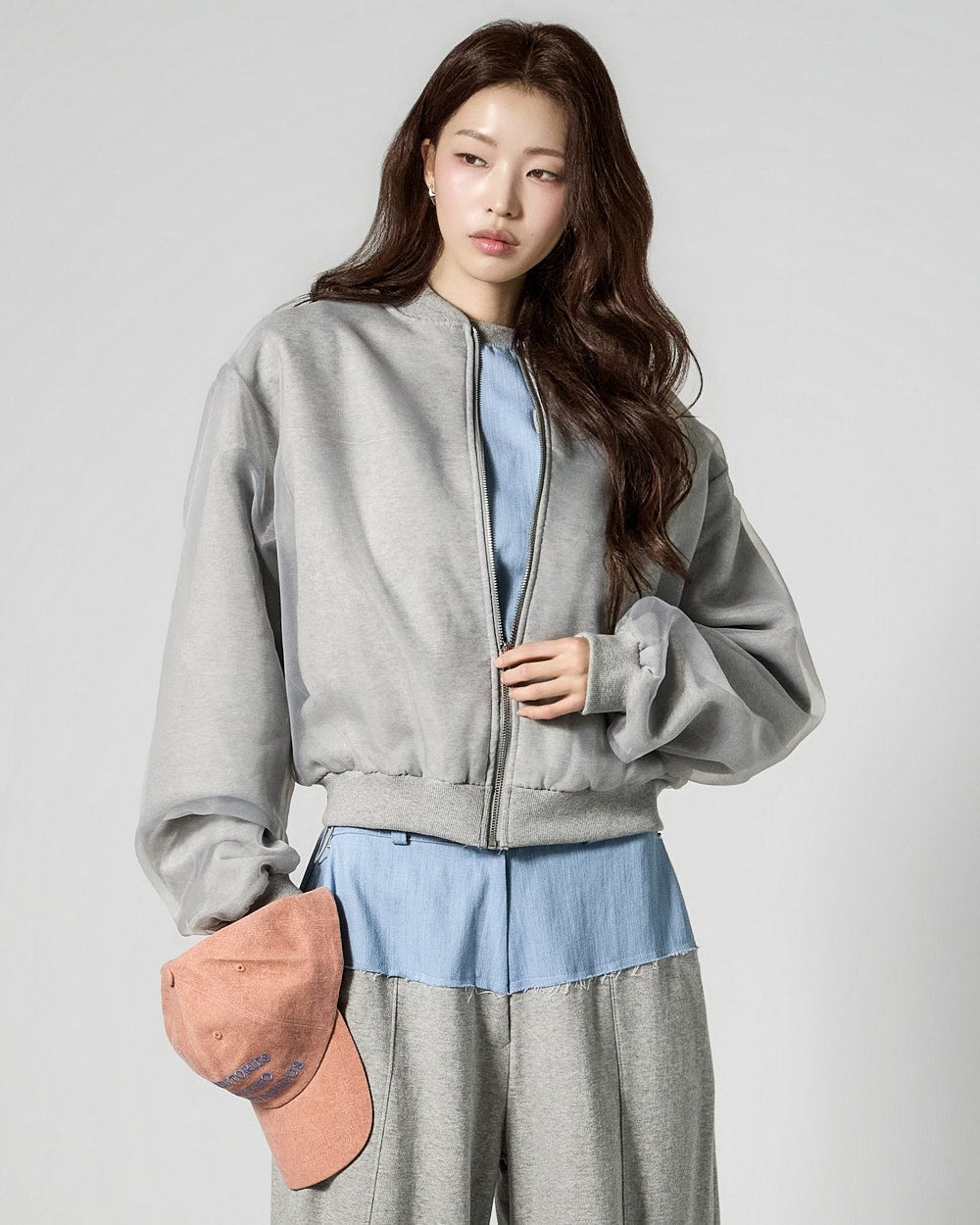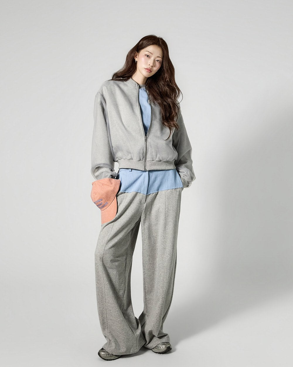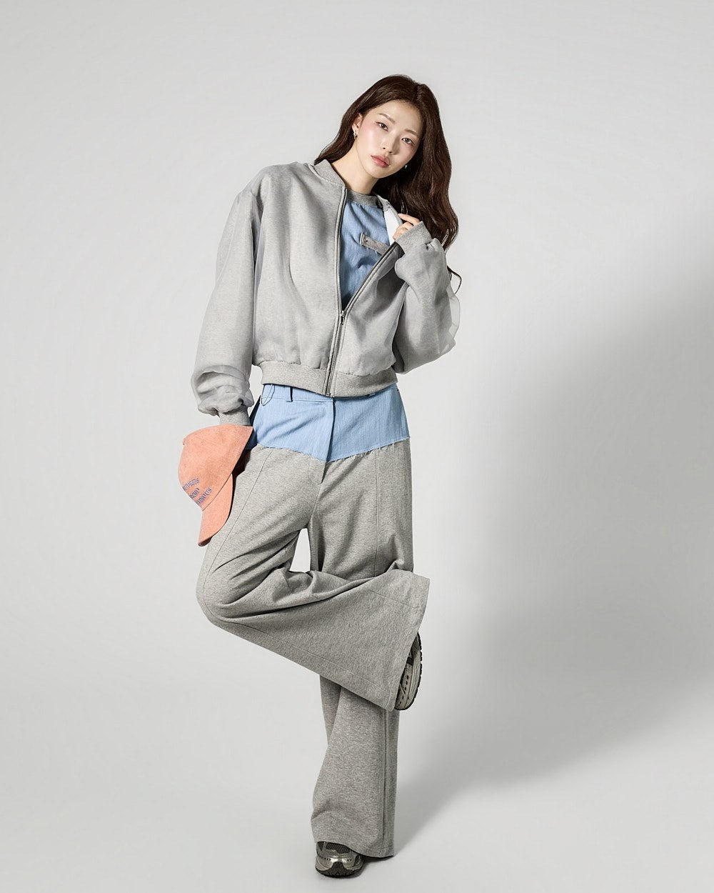 This is a denim contrast tracksuit set with a casual vibe.