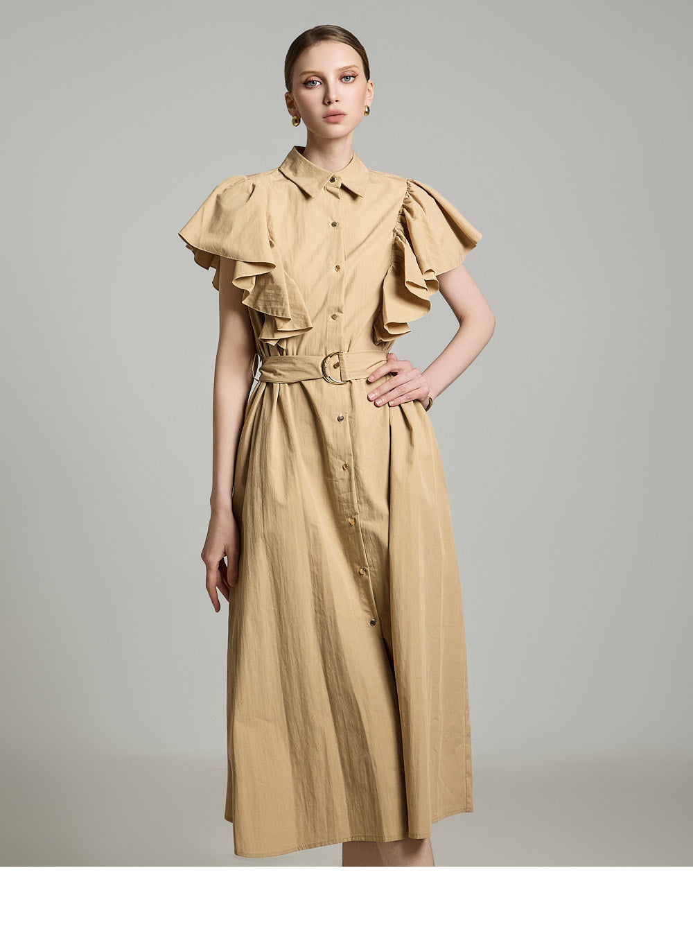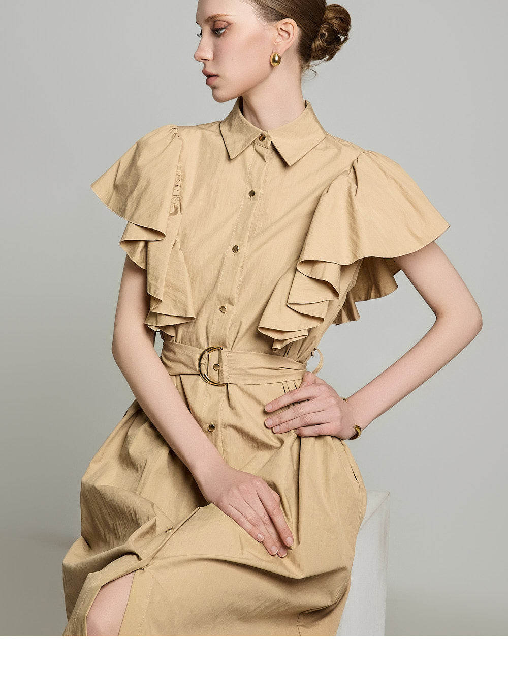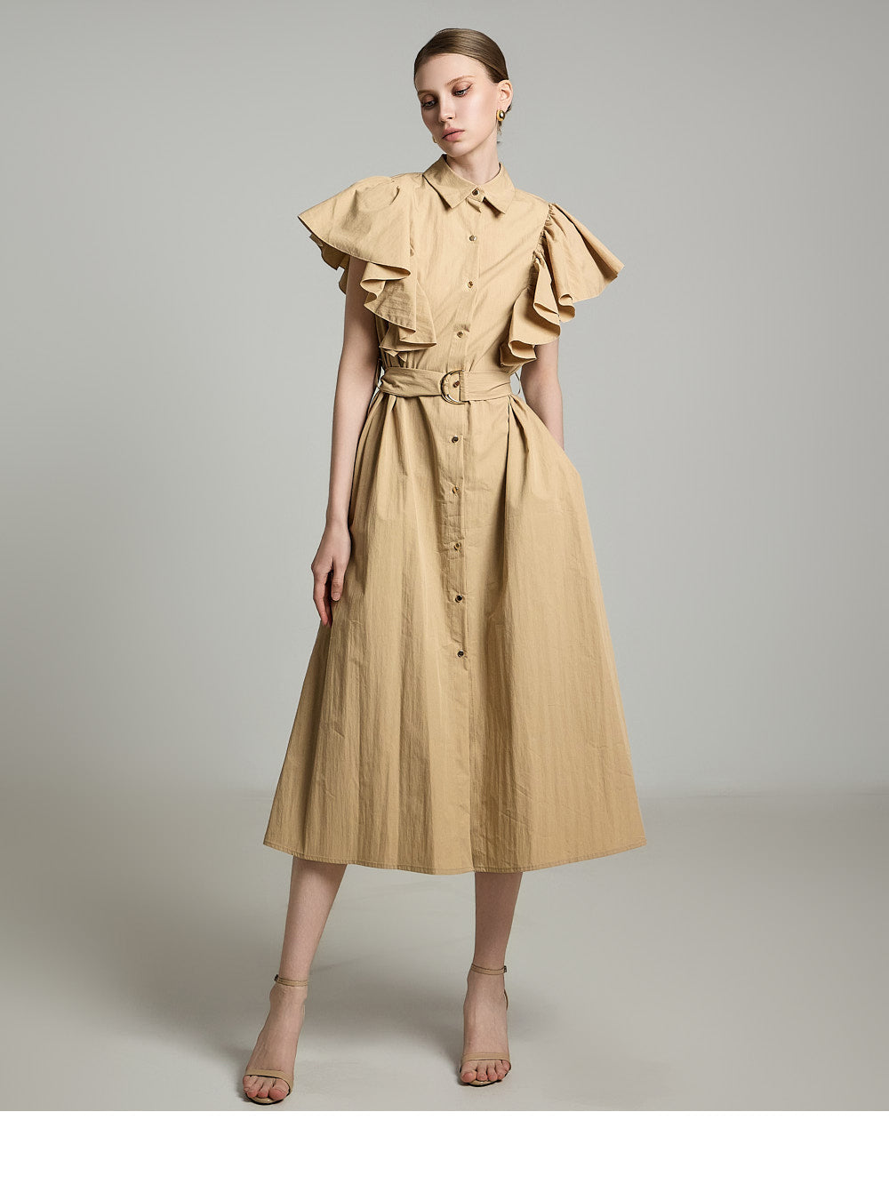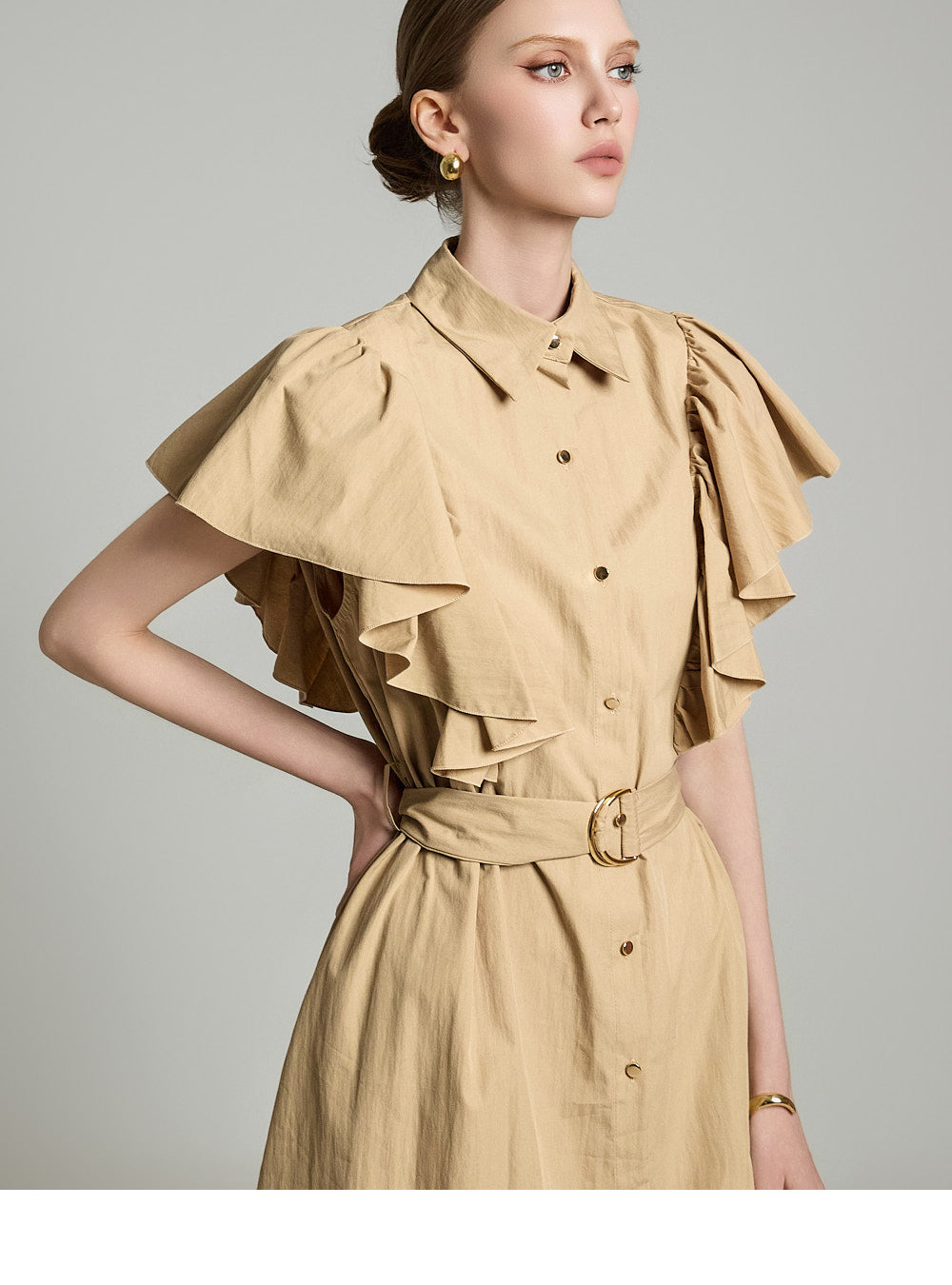 肩部褶边和金色纽扣增添了优雅精致的感觉,
