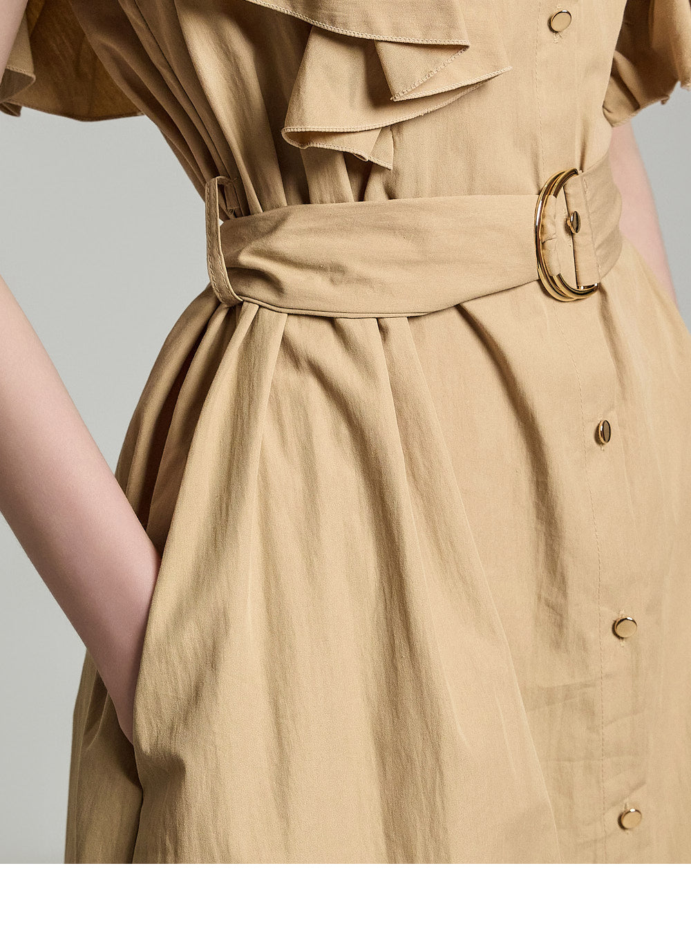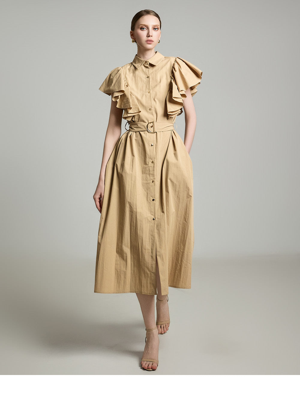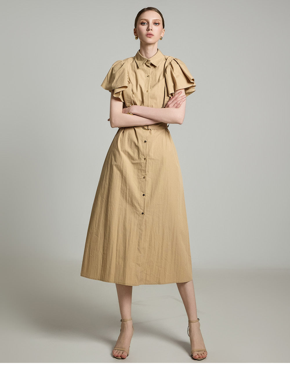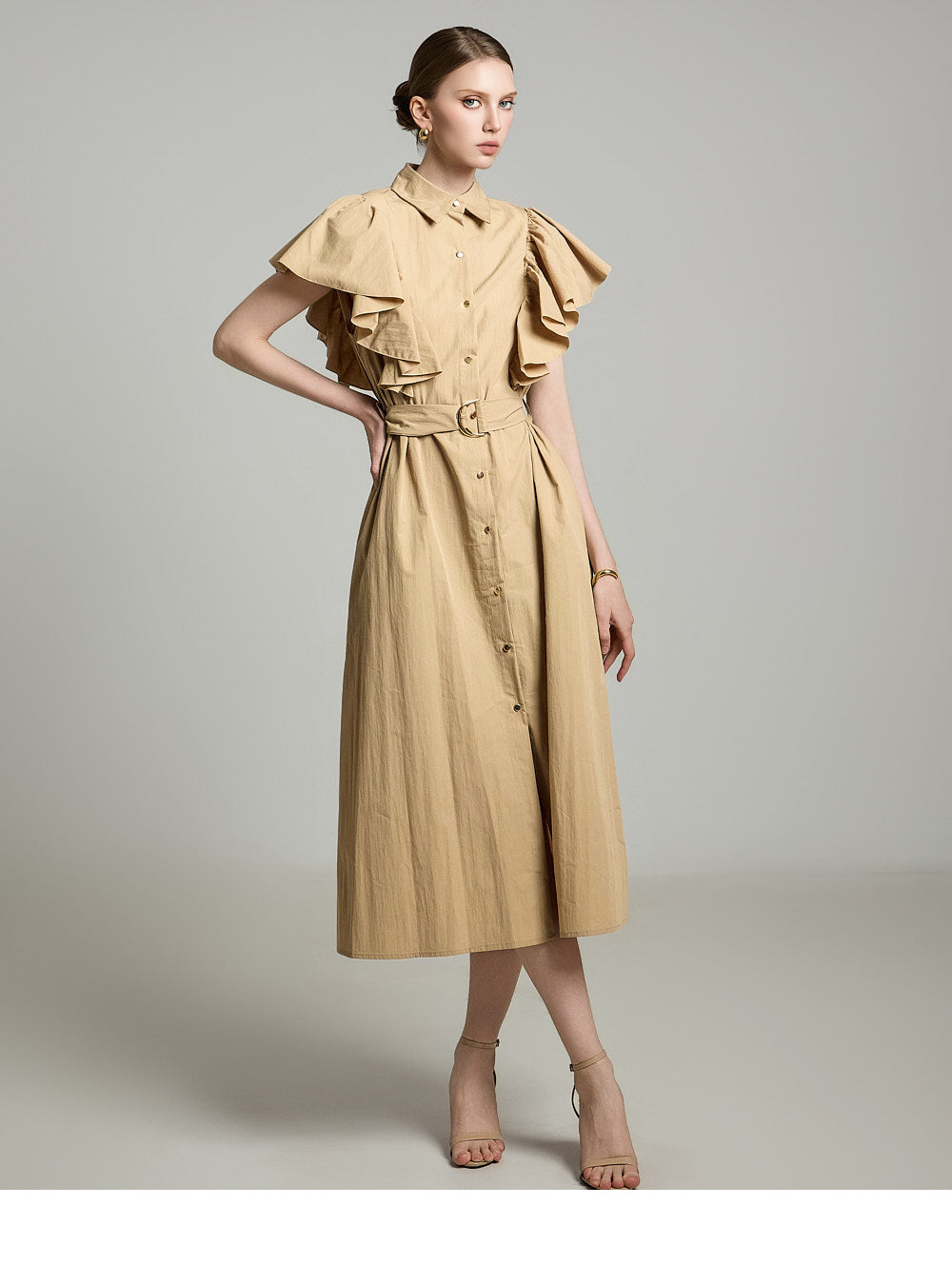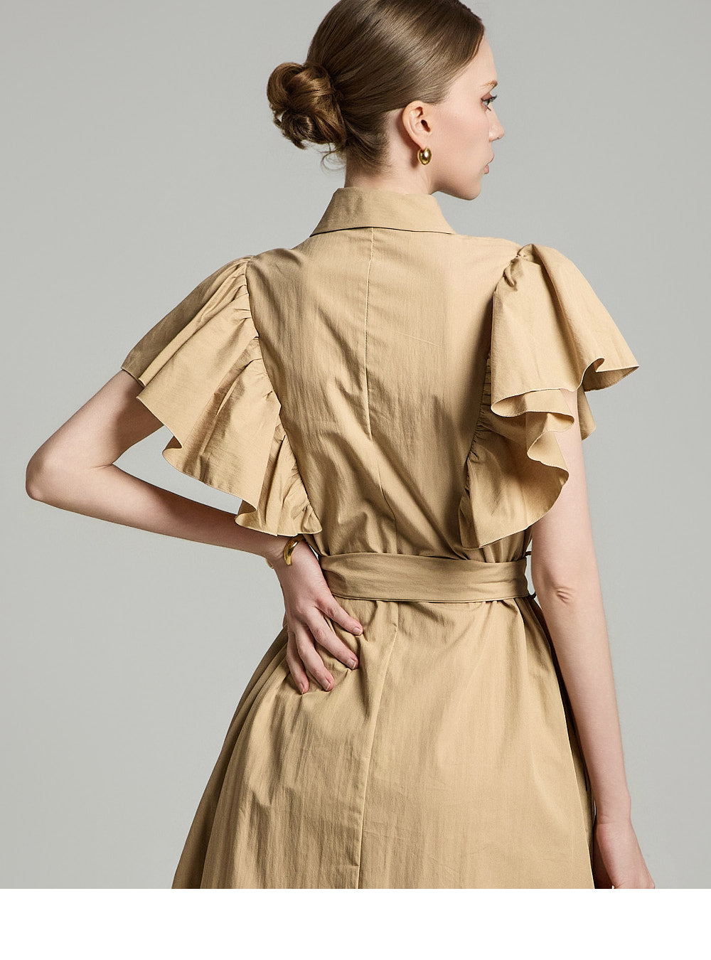 肩部褶边和金色纽扣增添了优雅精致的感觉,